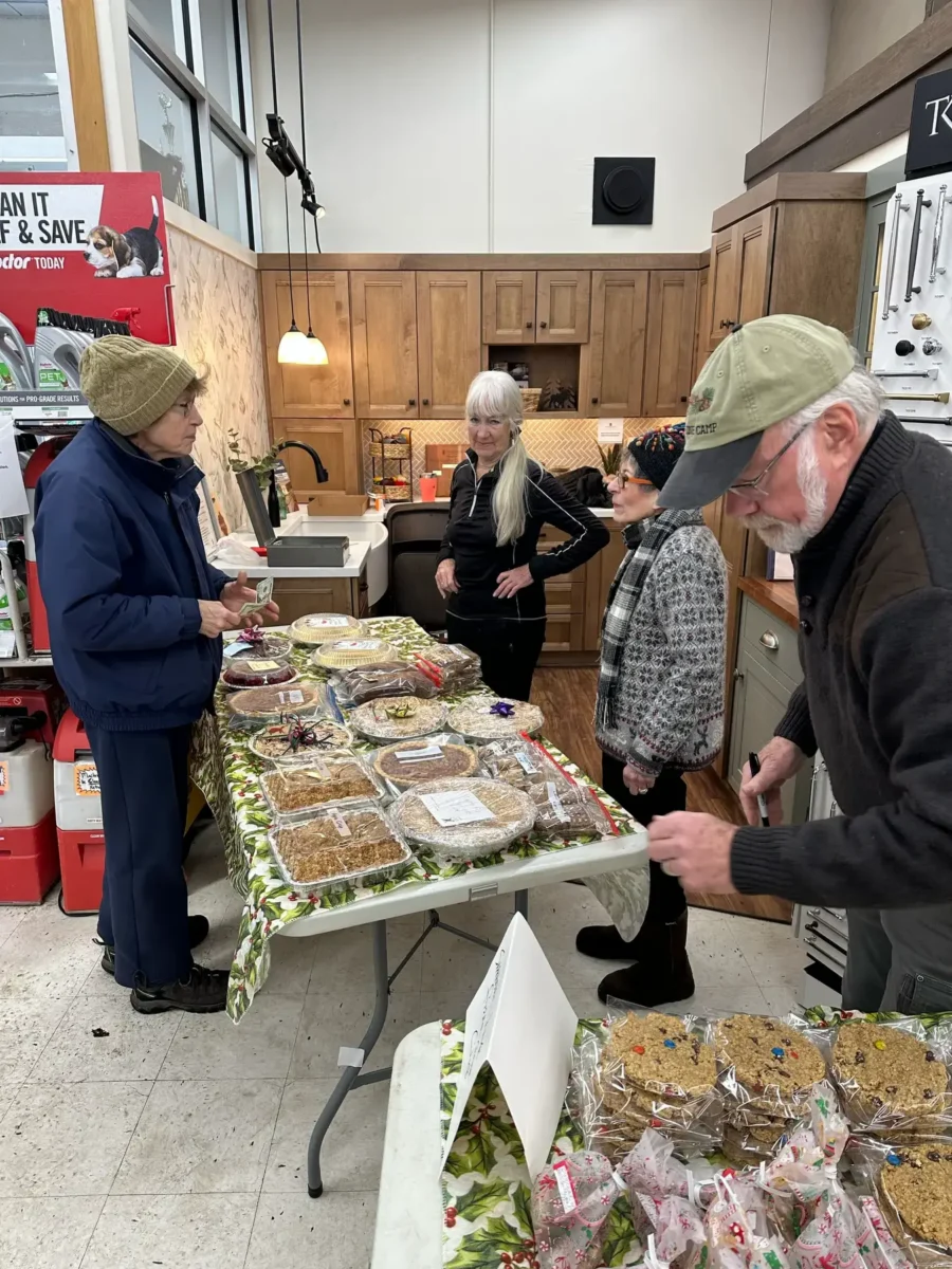 The Christmas Pie Sale occurs on the Saturday of the week before Christmas. This has been a traditional fund raiser for about 30 years. A small group of volunteers call the membership by telephone asking each household to make a bake good. We only sell homemade bake goods and feature pies. (If a pie is brought down that is not homemade it does not go into the sale) If the member does not bake pies then they supply homemade cakes, cookies or stollen. Berry and fruit pies sell the best and we get premium prices for our pies. A large berry or fruit pie would be sold in the neighborhood of $18. We know that the costs of making large juicy pies is not cheap and we value the labor and love in the making of such pies. Mincemeat is another big seller (we need to know if it is beef or venison) as is Coconut Cream. Some members specialize in some way. One member is known for her monster cookies while another makes sugarless baked goods for diabetics.